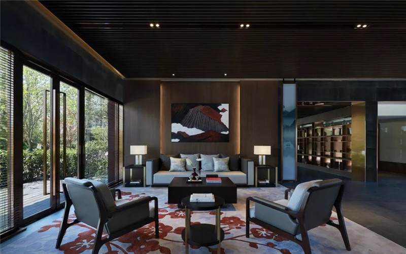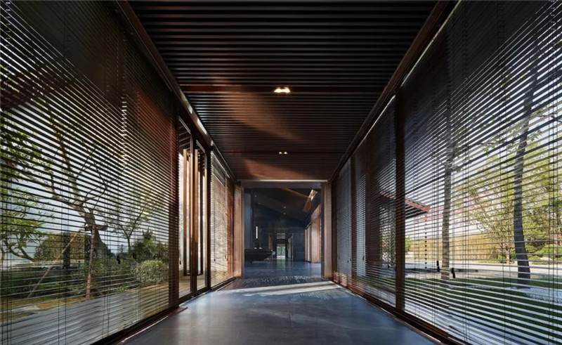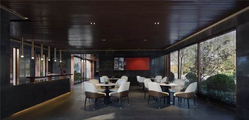 大堂西側,全景落地玻璃及百葉搭配,加以園林框景手法,呈現(xiàn)意境之美、隱隱約約之效。穿回廊而過,便見洽談區(qū),頓時豁然開朗。