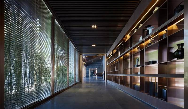 大堂東側,因勢利用通道設置藝術長廊,充沛的線條韻律,靈動的格架鏤空分割,虛實相生互補,氣場也在隨之巧妙切換。