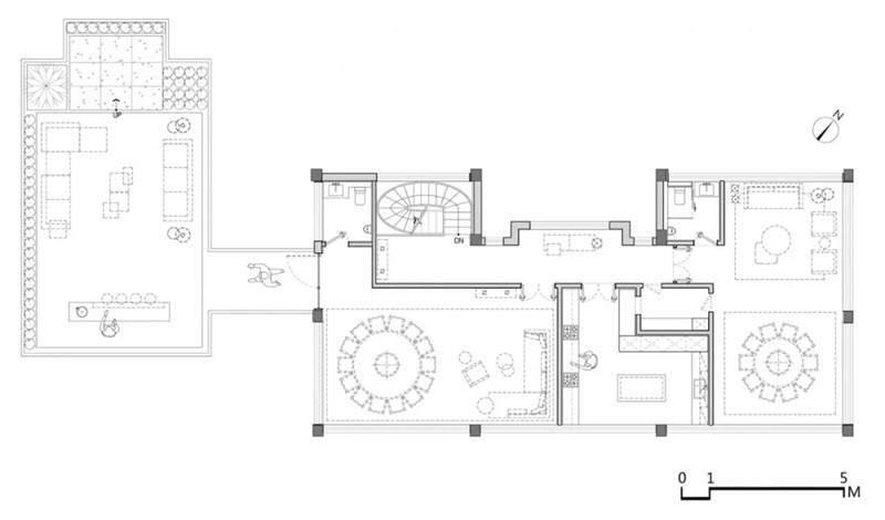 二樓設有兩間獨立包廂,供賓客攜友享用。保留古建筑原有傾斜屋頂,尊重格局而做設計,大道至簡,方圓之間,各得其妙。借由通透的落地窗引入美好景致,讓視線變得有趣,用餐更為舒適、自然。