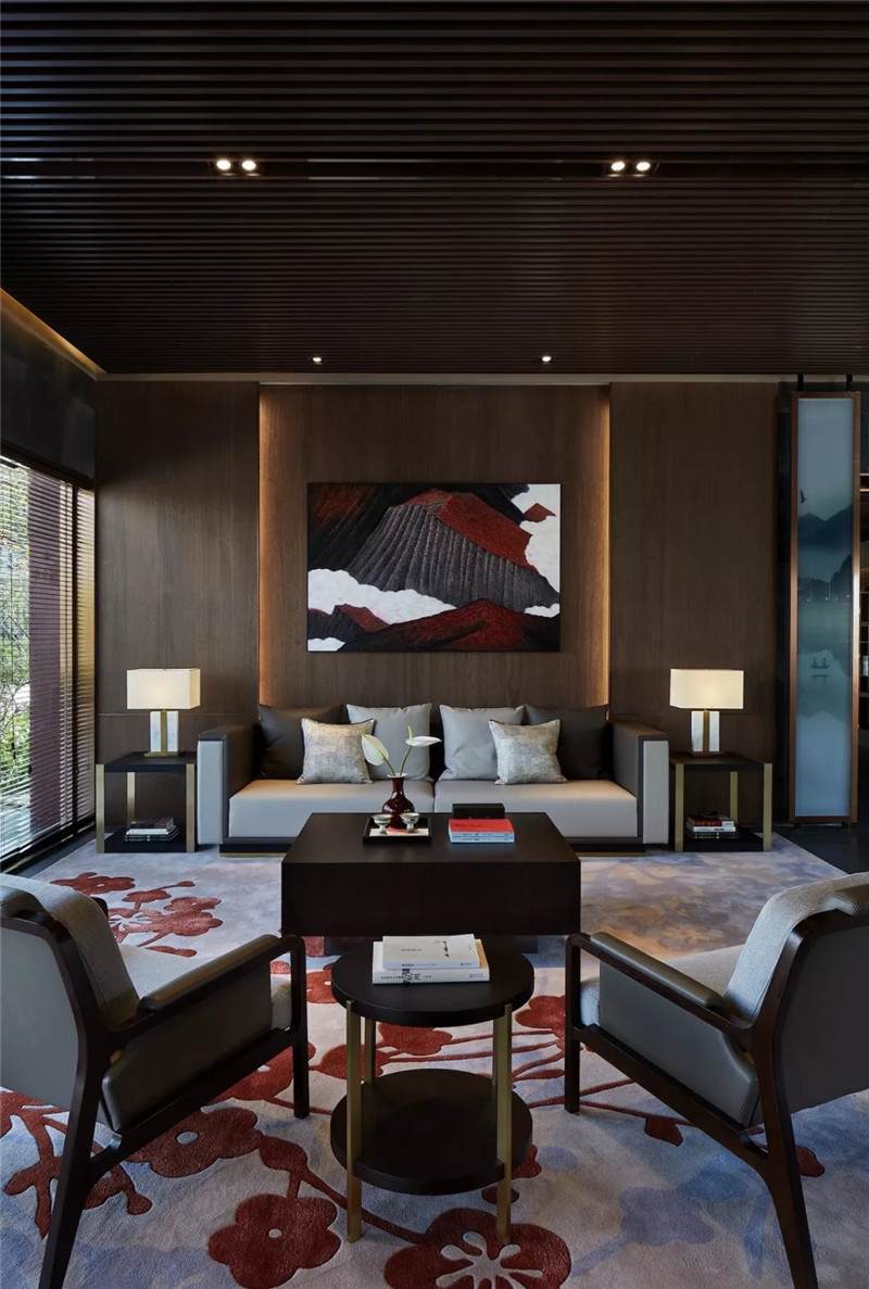 會客區(qū)處于中心茶臺兩端,對稱的手法、圍合的陳列、適宜的比例,實現(xiàn)多樣元素的碰撞演繹,剛柔并濟,飽含層次感。主背景木飾面嵌古銅,加上燈帶設置,顯得安靜而溫潤。