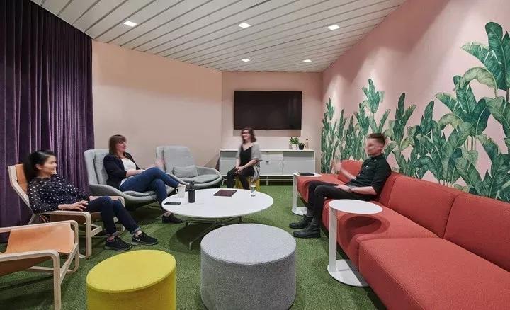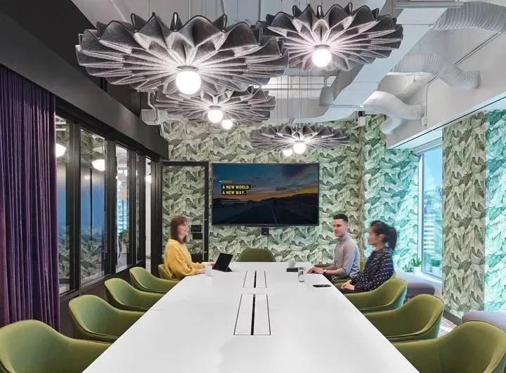 一間正式會(huì)議室,墻面鋪滿了綠色棕櫚葉墻紙,并配以綠色扶手軟椅,在綠色清新風(fēng)中,具有吸音性能的紫色布藝窗簾形成鮮明的色彩對(duì)比。毛氈聲學(xué)燈具BuzziPleat更是為整個(gè)空間錦上添花,帶來美美的視覺。