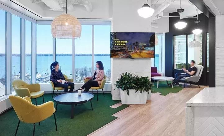 如“起居室”般的非正式會(huì)議室,則裝飾以居家般的家具營(yíng)造舒適的氛圍,透過開敞的落地窗,煙波浩淼的安大略湖的美景盡收眼底,縱目四望,曠達(dá)不羈。綠色草皮般的地毯在這里隨處可見。