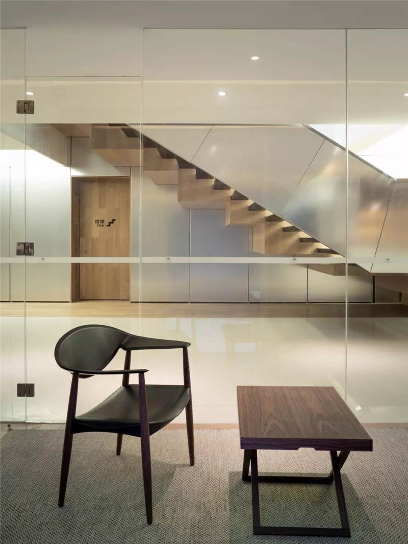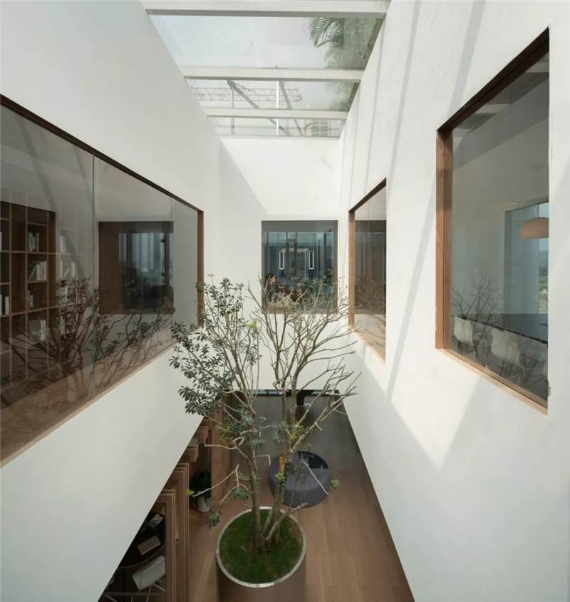 So in the space design, try to break theboundaries of indoor and outdoor spaces, and let the inner and outer spacescenes communicate with each other. The basement floor is the space fordiscussion and the outdoors is a sunken courtyard. The use of large glasspanels brings the courtyard landscape indoors. The staircase leading to thelobby is designed as a large staircase that opens to the courtyard, where youcan stay, relax and enjoy the view of the courtyard and the changes in lightand shadow. On the fourth and fifth floors, we designed a two-story rooflighting atrium going through the two stories with reference to the courtyardspace from the Lingnan Architecture – the skylight flows down from the top,spreads over the landscape tree on the atrium of the fourth floor, andoverflows in the space, creating an illusion that the interior is like anoutdoor courtyard.