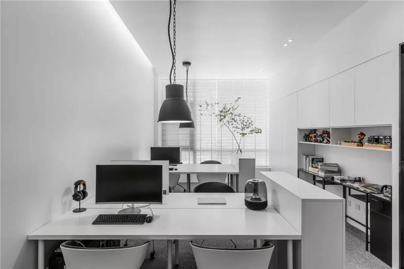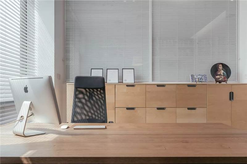 自由無拘的溝通對(duì)于團(tuán)隊(duì)的創(chuàng)新至關(guān)重要。開放的辦公區(qū)是有效獲取信息和激發(fā)靈感的地方。百葉窗折射的光影,充足的自然光營造高效的工作環(huán)境??臻g雖然有限,但發(fā)揮最大的性能,開辟出一整面的軟裝材料搭配區(qū)。