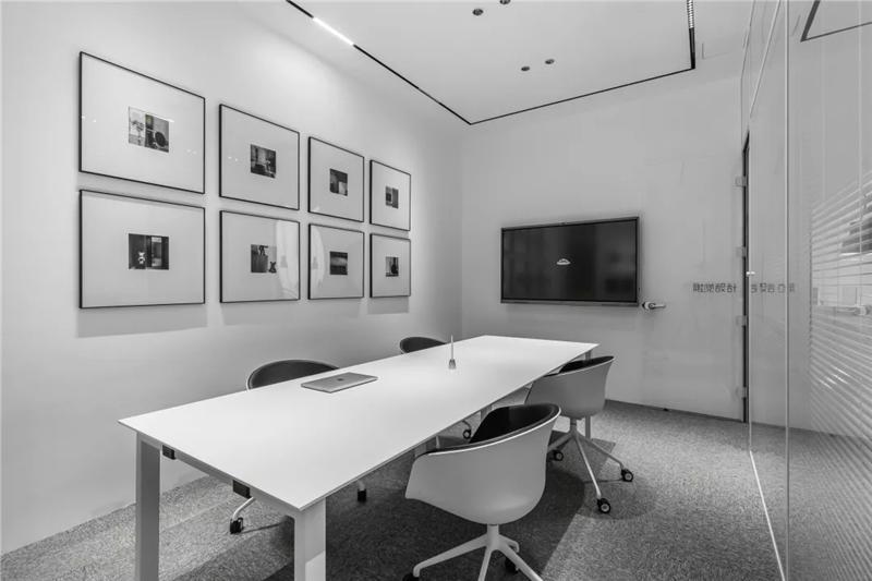 為了同時(shí)保證隱私和透明,張馳有道。會(huì)議室采用了玻璃+百葉窗的設(shè)計(jì),這樣的交流區(qū)域保持彼此的通透與聯(lián)接,提升了場(chǎng)所的張力。使用貼合設(shè)計(jì)的局部掛畫藝術(shù),配以金屬的深邃感官,多媒體影視裝置加強(qiáng)了墻面空間的信息輻射作用。