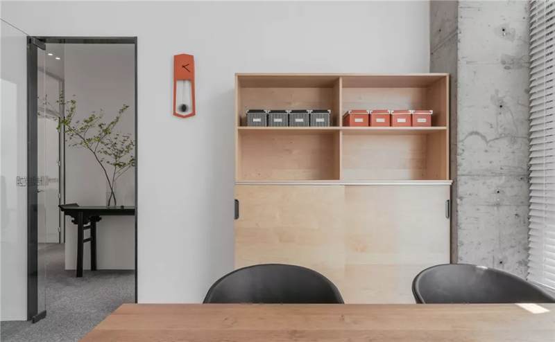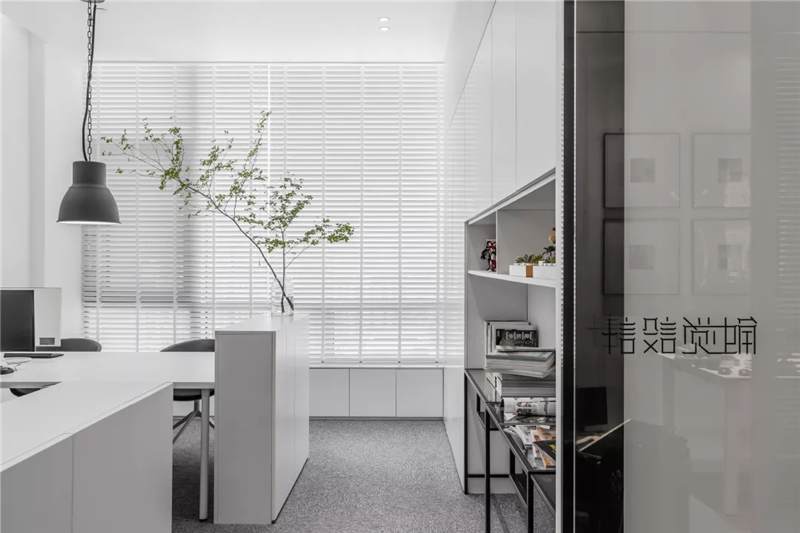 另一側(cè)的空間則增添了二三分私密性。沉穩(wěn)的木質(zhì)案桌上,擺放的綠枝椏仿若思想的觸手,與仙人掌、小株綠植串聯(lián)起空間動(dòng)線。區(qū)域內(nèi)各自獨(dú)立,用玻璃門分隔開,在保證個(gè)人能最大限度沉浸思維創(chuàng)作的同時(shí),又能及時(shí)地與伙伴交流互換,碰撞不同的思想。