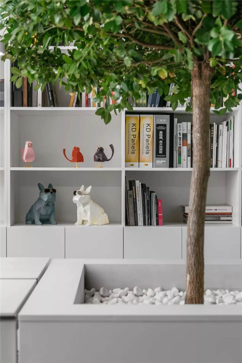 在這里,未知的一切與既有的常識(shí)記憶產(chǎn)生傳導(dǎo),想象思維的觸角開始蔓延。小株綠樹分隔出挑高的白色高座式二人桌,提供了一種更為隨性、更利于面對(duì)面交流的辦公形式。