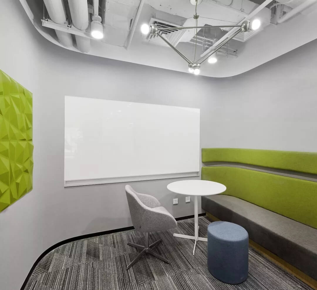 在軟裝設(shè)計(jì)上,該區(qū)域家具軟裝及墻壁,選擇明快的色調(diào),展示青春活力,并且用黑色烤漆玻璃內(nèi)嵌燈帶的方式營(yíng)造氛圍,透著數(shù)字化和科技感,表現(xiàn)商湯在數(shù)字時(shí)代的不同場(chǎng)景中,所呈現(xiàn)的多元化和創(chuàng)新性。