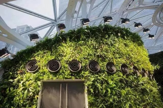 整個玻璃溫室空氣濕度維持在60%,相比之下, 一個典型辦公室的濕度是30% 。內(nèi)部空間白天的平均溫度為22度,晚上大約是13度。而溫暖潮濕的空氣得益于植物墻上的通風(fēng)管道,隱藏的通風(fēng)系統(tǒng)可以吸入新鮮空氣并模擬自然風(fēng)。