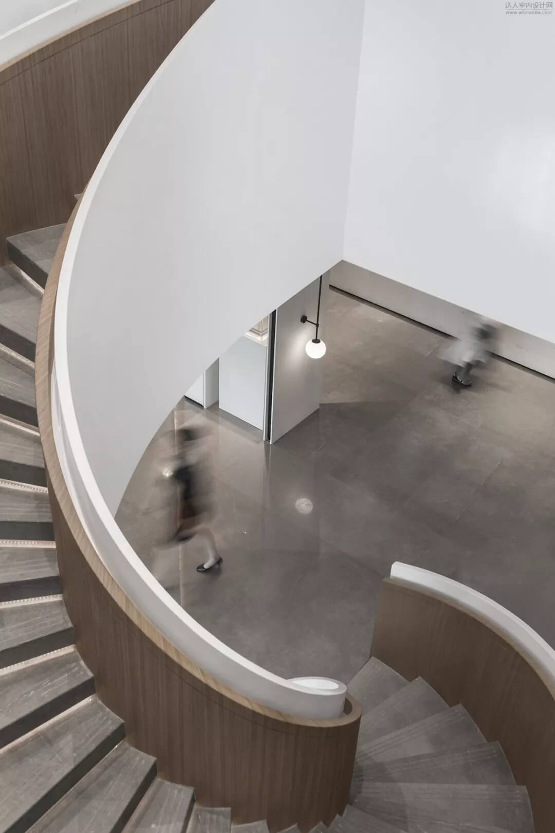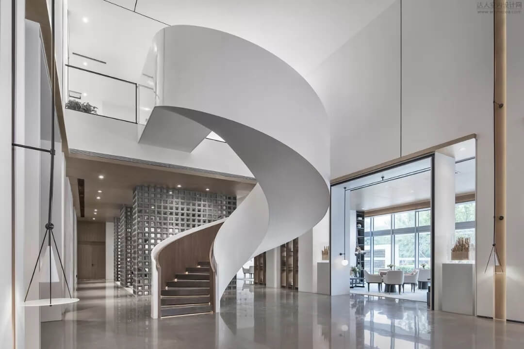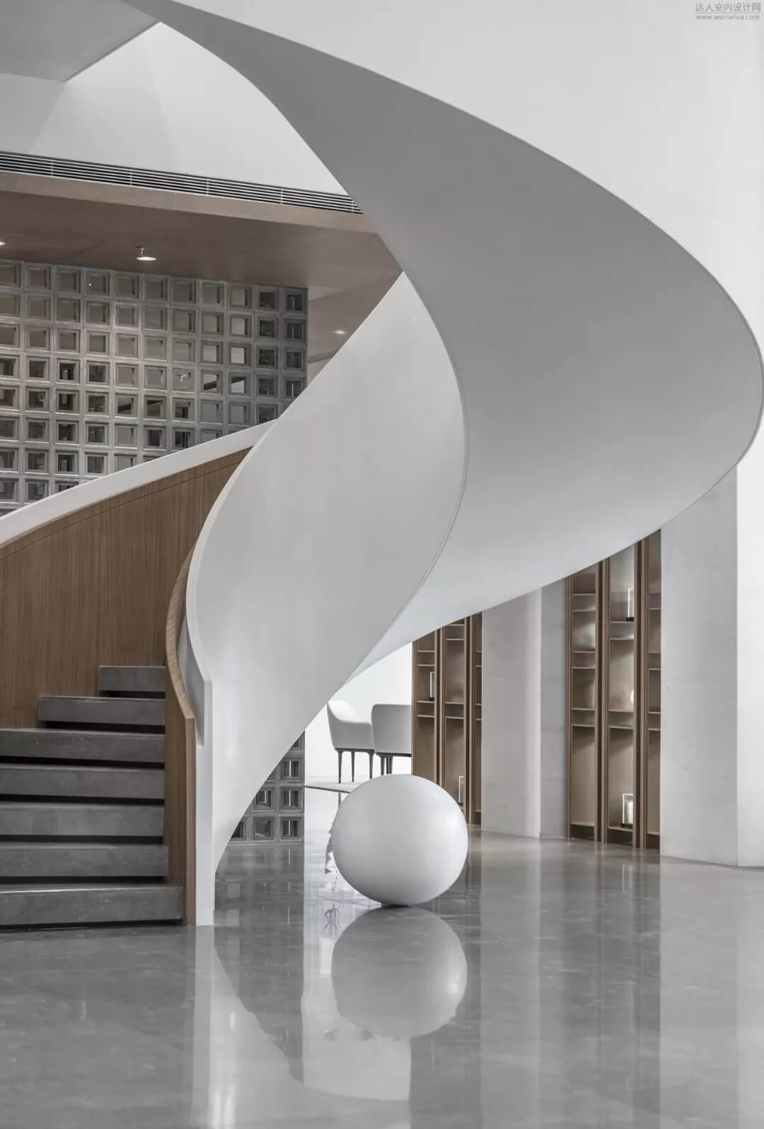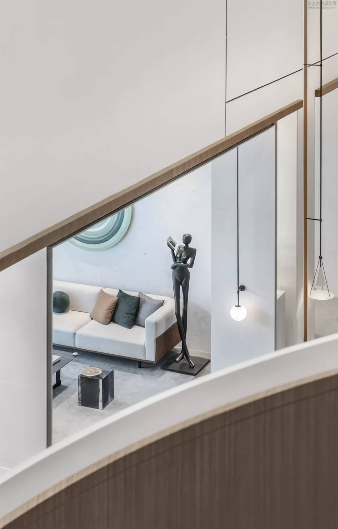 淡雅的白色配以溫馨木色的夢幻般旋轉(zhuǎn)樓梯入口,白色球體與之呼應(yīng),旋轉(zhuǎn)而上,動態(tài)感的景色盡收眼底,格子狀猶如延續(xù)的·星際穿越,感受平衡時空不同維度的交措時光,身處'空間',在無限與有限中穿梭,不經(jīng)意的轉(zhuǎn)角余光是同色的球燈相映,優(yōu)秀的設(shè)計師是會講故事的人。