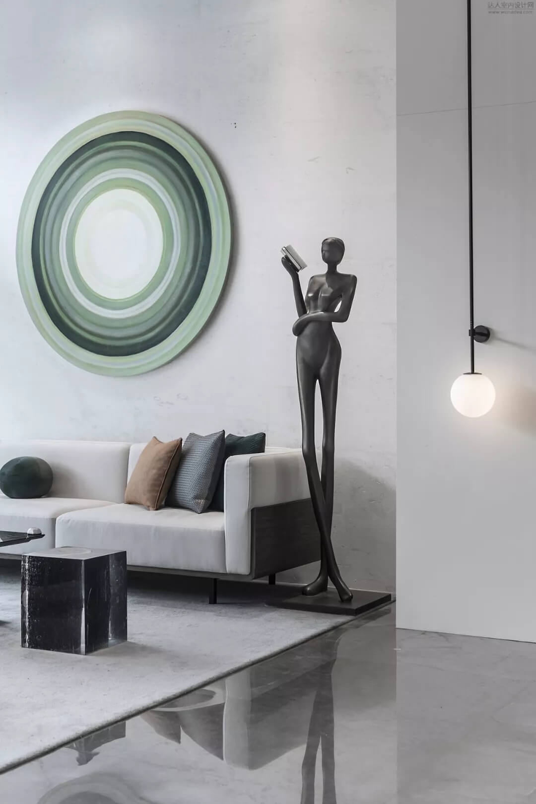 文明的前行離不開知識的積累,時間的沉淀會給人類提供更多的寶貴經(jīng)驗,有心的設(shè)計靜立與整個空間,凝結(jié)的時間之輪·以樹木年輪為靈感是此處洽談區(qū)的特色,手拿書籍的雕塑予以智慧的氣息的重要性。