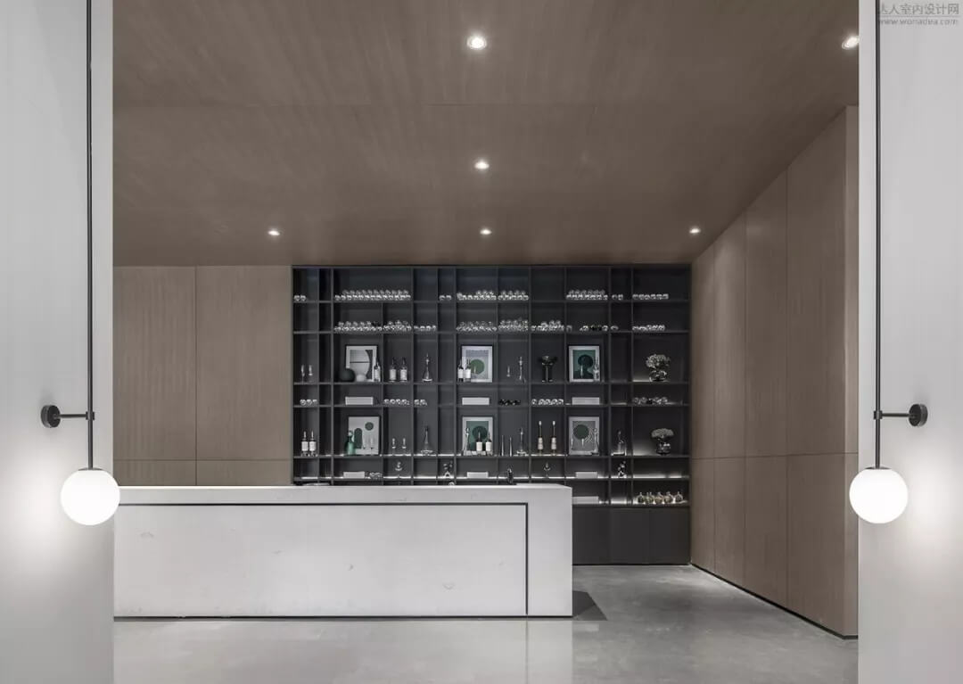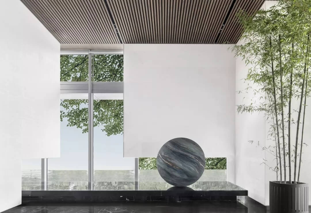 進(jìn)入前廳,暗涌波動的猶如海洋的紋理型球狀醒目與空間,設(shè)計師賦予的撞色又猶如浩瀚星空。以玻璃與室外的相隔,營造視覺的感覺錯覺,仿若一體的空間綿延。