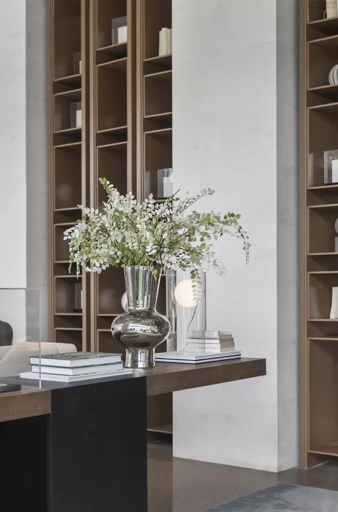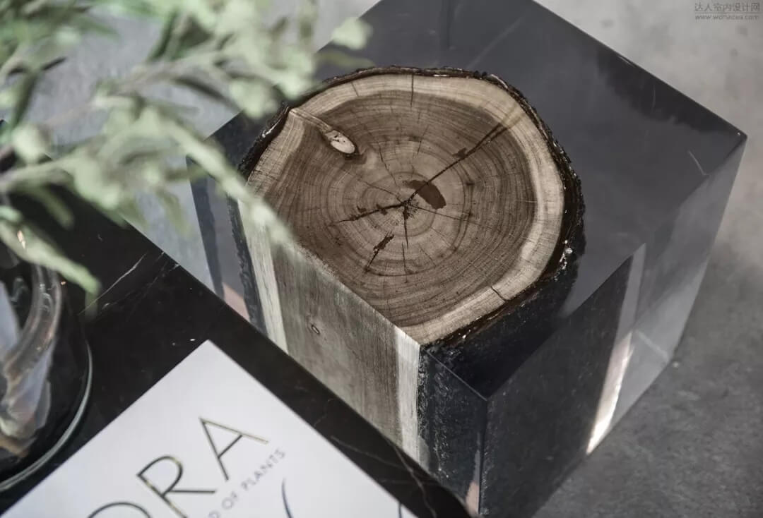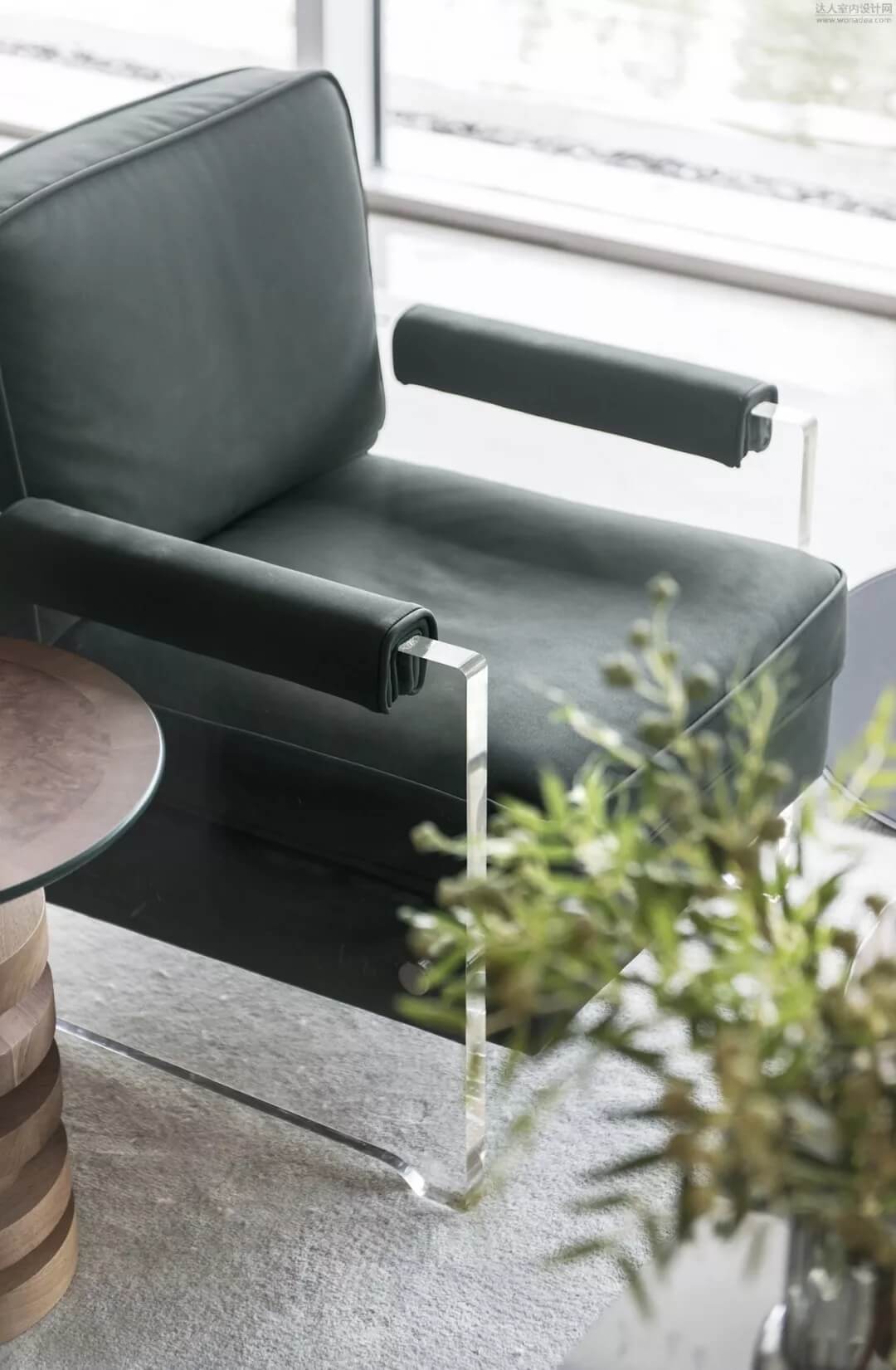 尊重木質(zhì)的肌理美感,熟諳工藝,亞克力材質(zhì)包裹的木質(zhì)年輪,如同凍結(jié)了時間的流逝,守住這一刻的永恒。簡潔的質(zhì)感綠色皮質(zhì)沙發(fā)予以低調(diào)的奢華,同色系的植被增加了空間層次感。