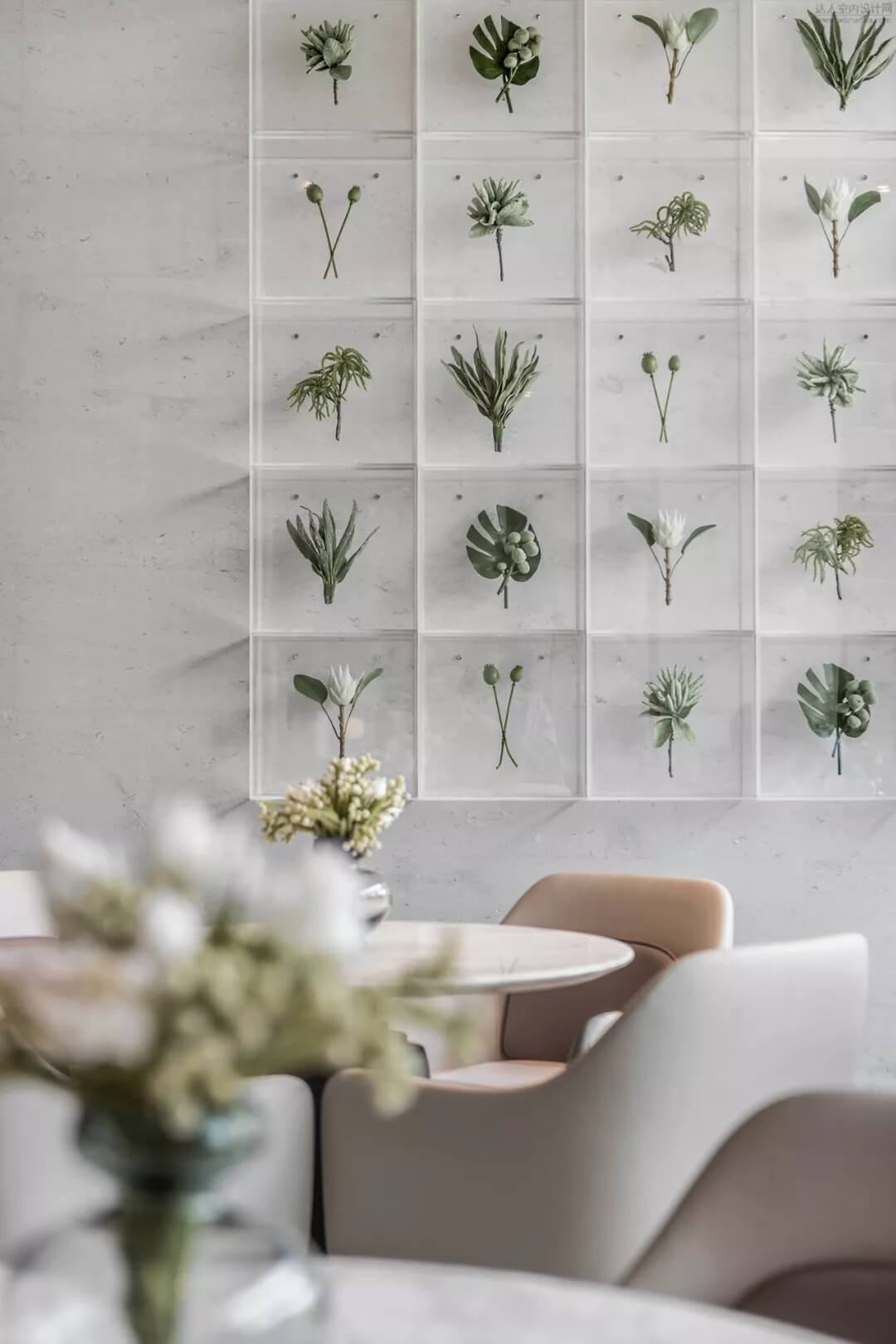 洽談區(qū)的一面墻壁,猶如進(jìn)入了植物博物館,自然果實鑲嵌與其中,綠色是植被的主色,也是和平的代表,也是予以生命呼吸之本源,每個小小的果殼中都孕育著無限大的能量。