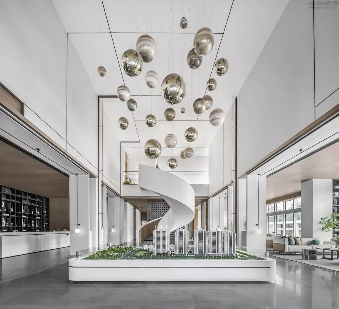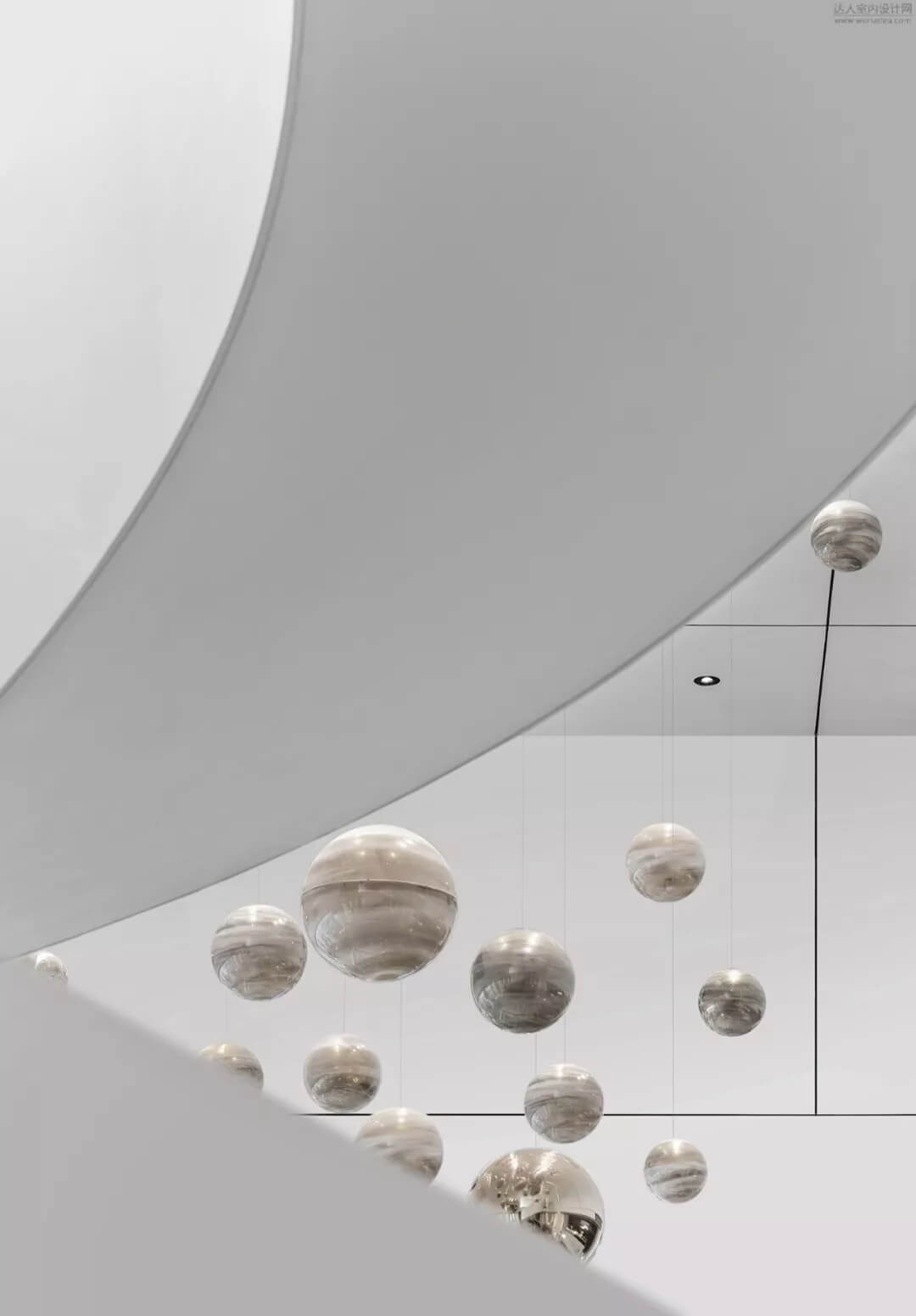 以和諧地球為理念展開的設(shè)計元素,售樓處上方錯落有致、大小不同的球體精致的點(diǎn)綴著空間,紋理折射光線,以靜止?fàn)顟B(tài)演繹動態(tài)。