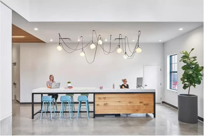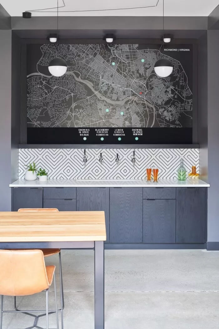 曾經(jīng)被濫用的中庭被重新構(gòu)想成該機(jī)構(gòu)的心臟-充滿活力的會(huì)議區(qū)和一間酒吧,設(shè)有來自里士滿地區(qū)的旋轉(zhuǎn)水龍頭。大堂取代了傳統(tǒng)的bun堡般的接待臺(tái)和獨(dú)立的休息區(qū),而是變成了一個(gè)畫廊—充滿活力,動(dòng)感十足,并嵌入了里士滿的性格。還有接待處?那個(gè)也被定制的鋼制桌子代替,該桌子可以兼作員工的共同工作空間。