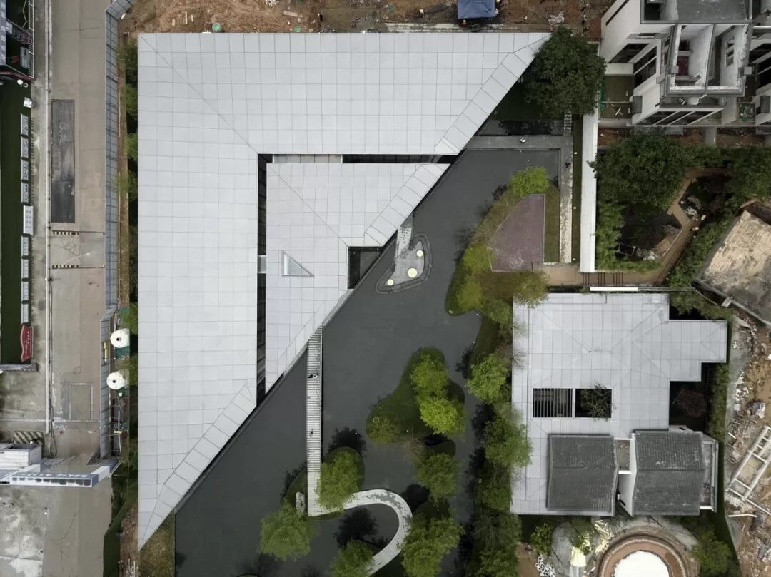 同時(shí),整個(gè)建筑運(yùn)用了現(xiàn)代構(gòu)圖的方式,突破了傳統(tǒng)對(duì)稱的客家建筑特征,將多個(gè)同心半圓演化成多個(gè)相似三角形,構(gòu)成了不對(duì)稱的幾何空間;巧妙地通過(guò)線與面的緩急對(duì)比加強(qiáng)了視覺(jué)上的層次感,以不同的設(shè)計(jì)手法,在保持建筑與外部交匯貫通的關(guān)系的同時(shí),強(qiáng)化了建筑的縱深感。
