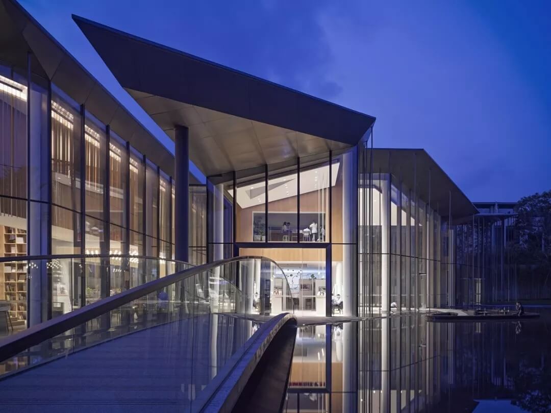 懸挑的頂棚引導(dǎo)游客進(jìn)入建筑內(nèi)部,映入眼簾的是錯(cuò)落分布著木質(zhì)懸浮盒子的雙層十米挑高空間。同時(shí)大面積的玻璃幕墻營(yíng)造的通透感,使得無(wú)論哪個(gè)方位,都具有內(nèi)外空間相通的視覺(jué)體驗(yàn)。隱藏在水池中的下沉休息區(qū),懸掛在天花上的木隔柵,穿插在旋轉(zhuǎn)樓梯和書架之間的休閑洽談區(qū),還有較為隱蔽私密的二層貴賓室,多個(gè)不同功能的空間仿佛彼此獨(dú)立,卻又渾然一體。