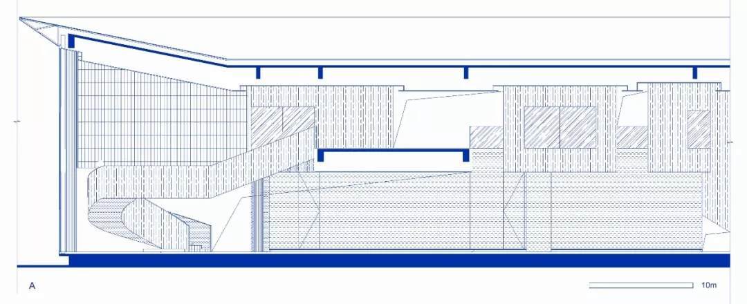 為了適應(yīng)當(dāng)?shù)貧夂?,建筑師在南翼雙層通高的開(kāi)敞空間內(nèi)設(shè)置了懸垂的木隔柵,可以達(dá)到舒適的遮陽(yáng)效果,并且具有空間劃分的功能。公共洽談區(qū),雙層書架,咖啡吧就位于此。平行垂落且錯(cuò)落的木隔柵打破了安靜的空間氛圍,和室外的廊柱相互呼應(yīng)的同時(shí),密布的木隔柵也自身形成體量與二層的功能體塊虛實(shí)相生。