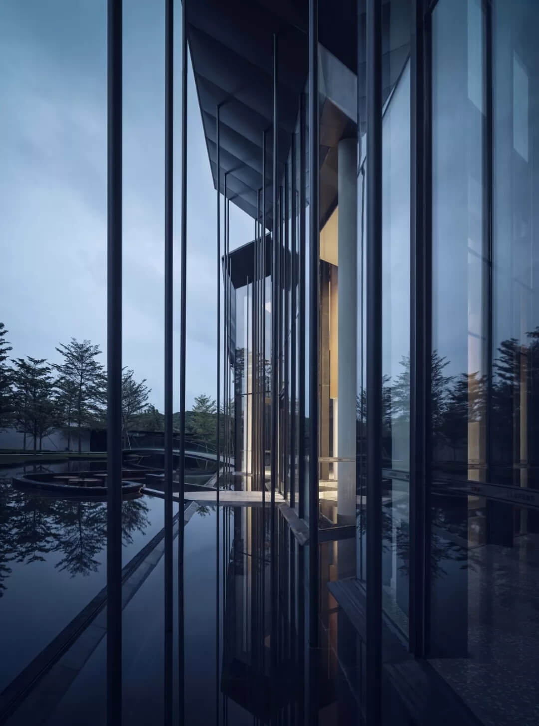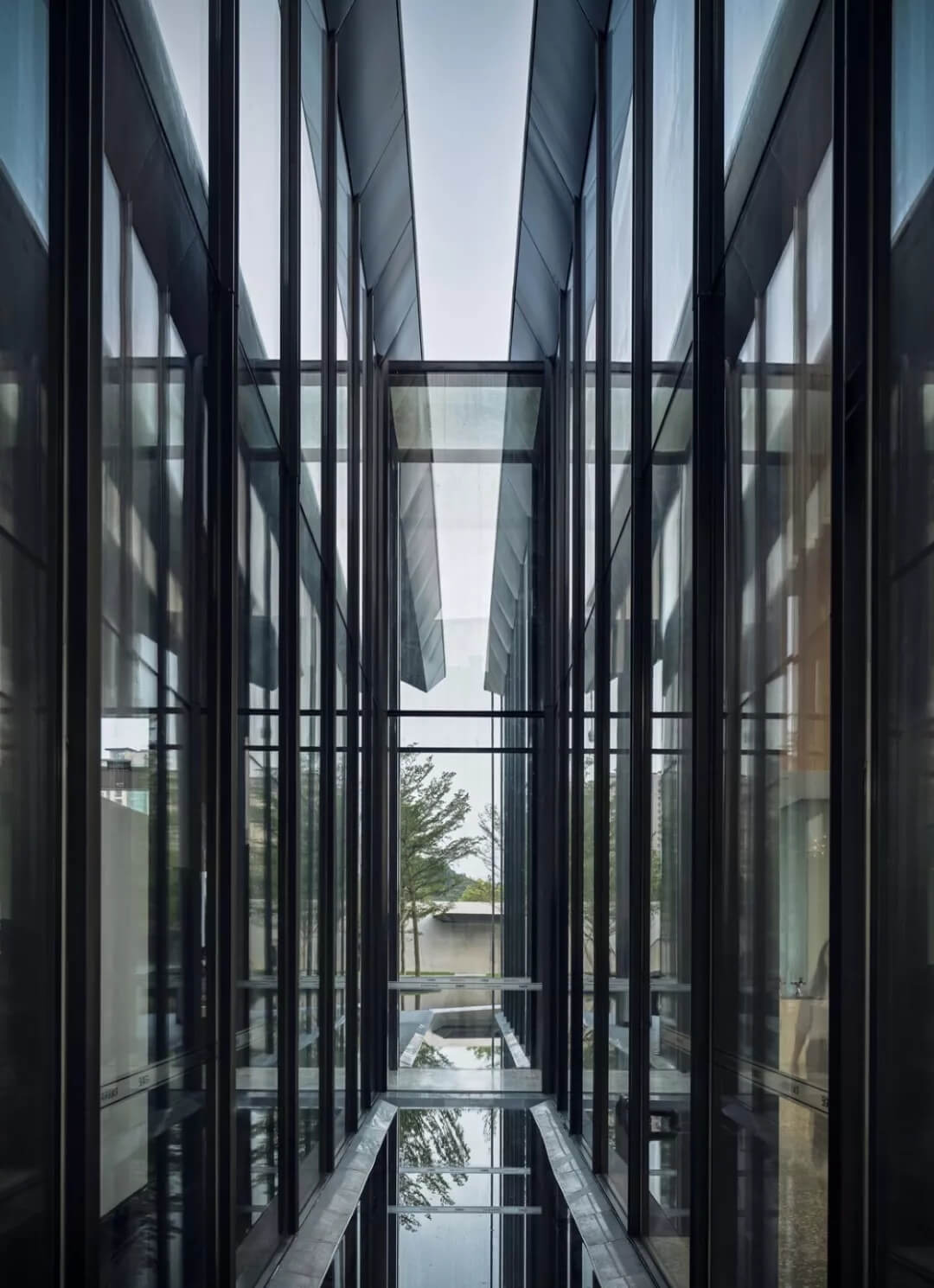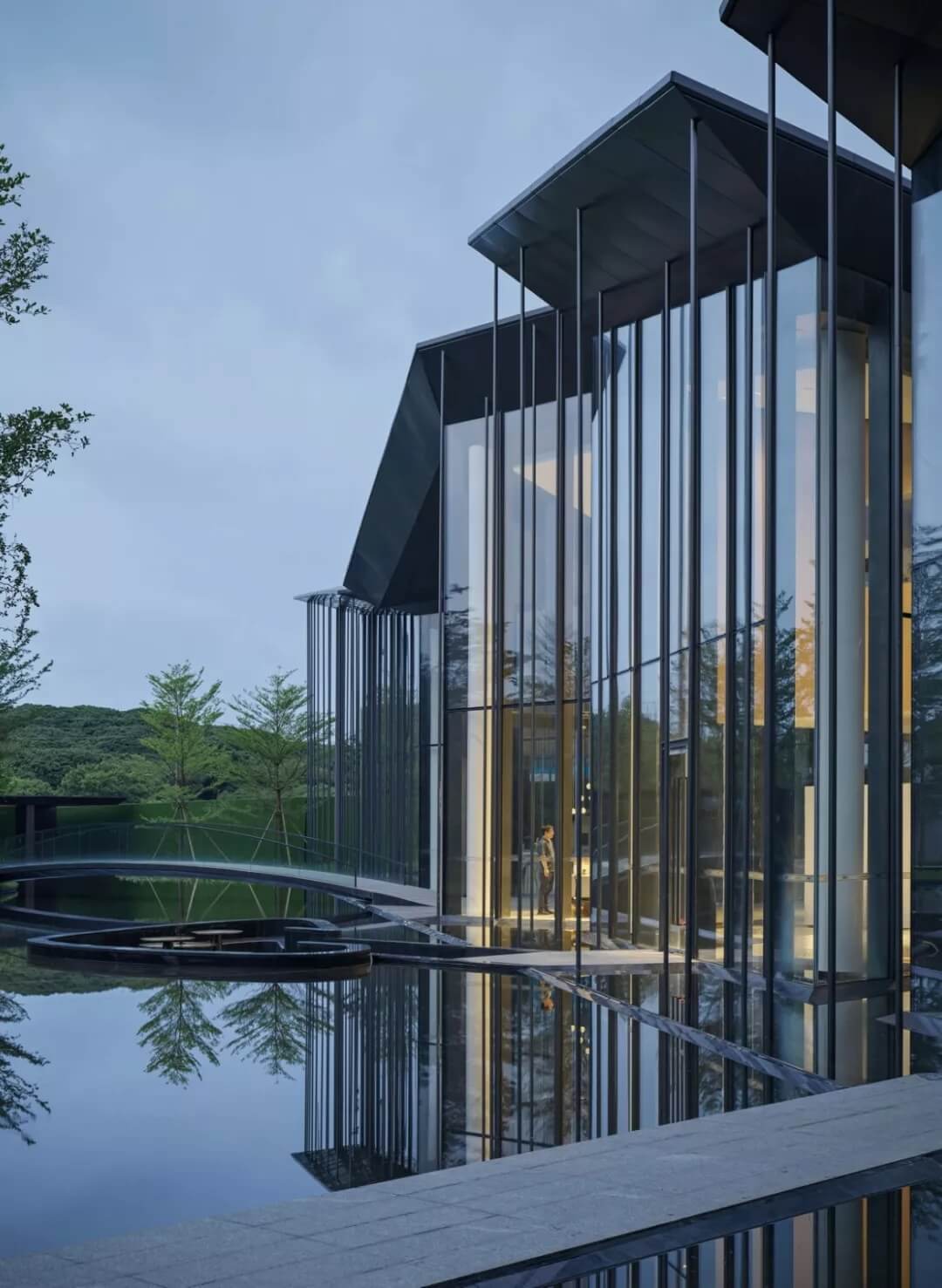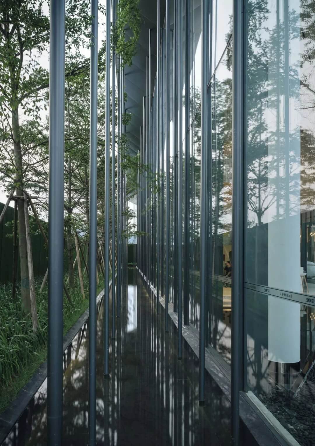 在這個(gè)項(xiàng)目中,建筑師嘗試用現(xiàn)代的理念、結(jié)構(gòu)和材料來(lái)打造由封閉走向開(kāi)放融合的客家建筑,創(chuàng)造出傳統(tǒng)文化和現(xiàn)代觀念相結(jié)合的建筑形態(tài)。如同客家建筑大多坐落于山水樹(shù)林間,這座雙層建筑與周圍自然景觀也保持著親密聯(lián)系。剪影式的三角形頂棚如同山的影子般遮蓋著地面;而支撐著整個(gè)三角屋頂?shù)慕饘僦韧鹑裘艿臉?shù)林,與戶外的樹(shù)木連成一片;環(huán)繞場(chǎng)地的水景弱化了由剛性的幾何平面帶來(lái)的疏離感,大面積的玻璃的應(yīng)用,引入周圍綠色景觀,重新定義了建筑與周邊的環(huán)境關(guān)系。莊重但不厚重的頂棚,高聳錯(cuò)落的柱廊,通透的落地玻璃,山與樹(shù)與水。