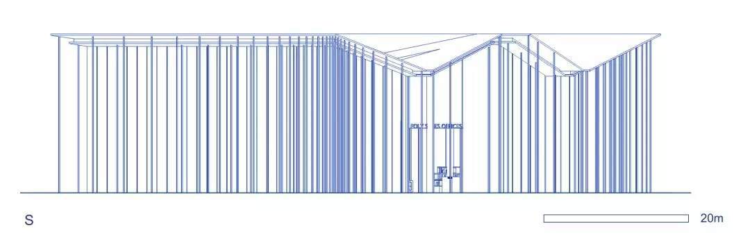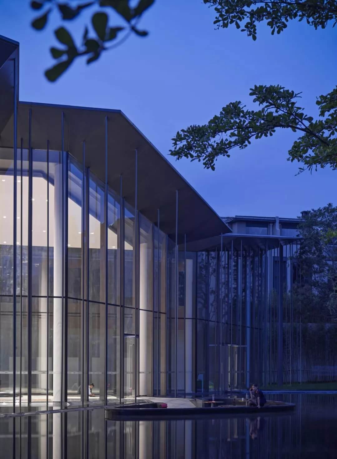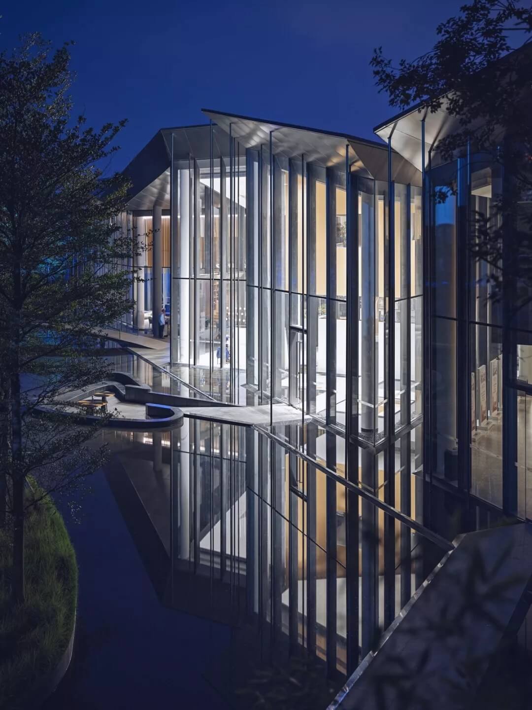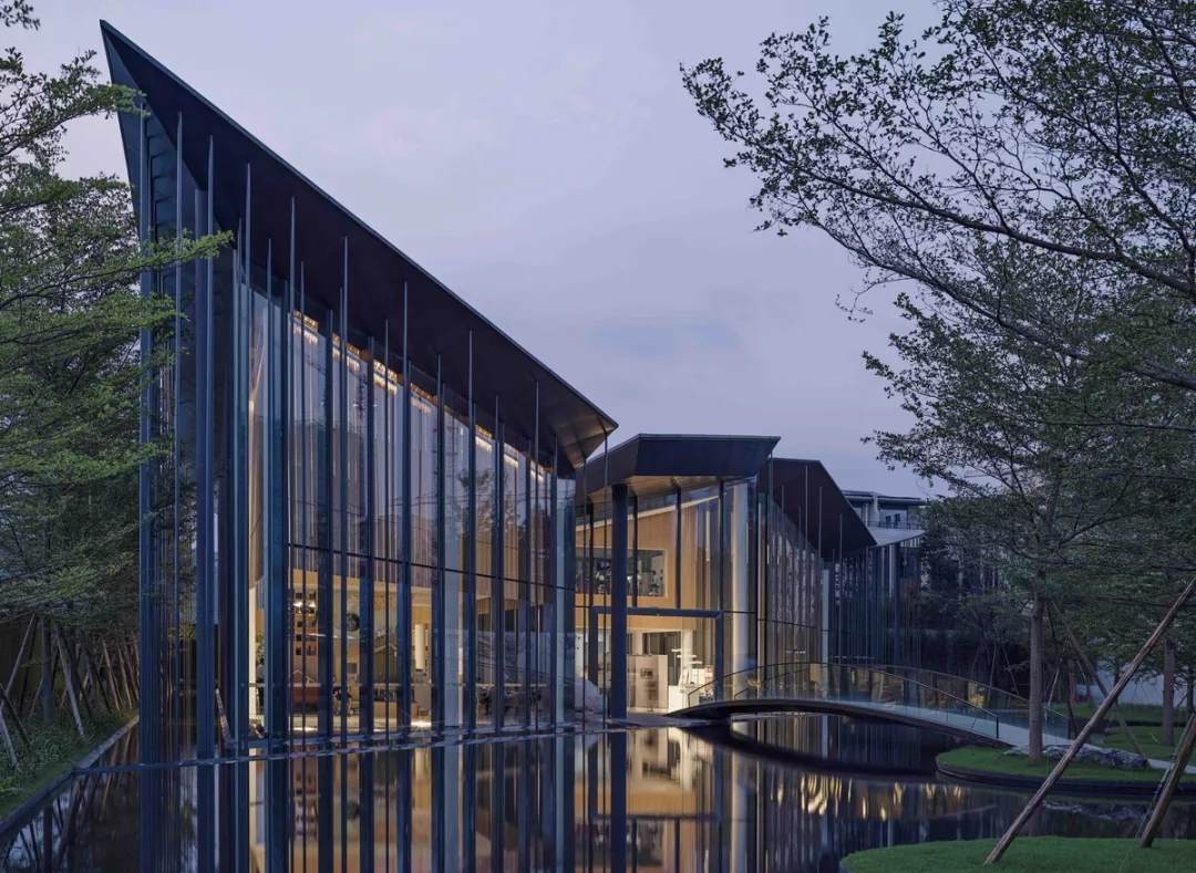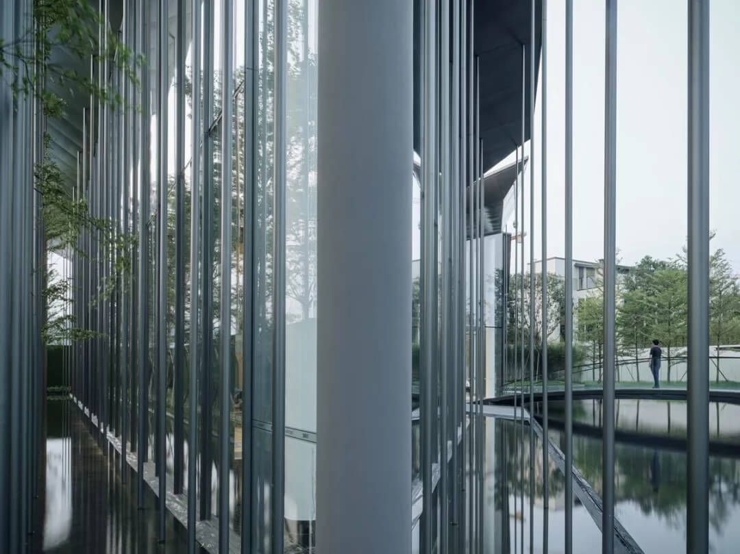 在這個(gè)項(xiàng)目中,建筑師嘗試用現(xiàn)代的理念、結(jié)構(gòu)和材料來(lái)打造由封閉走向開(kāi)放融合的客家建筑,創(chuàng)造出傳統(tǒng)文化和現(xiàn)代觀念相結(jié)合的建筑形態(tài)。如同客家建筑大多坐落于山水樹(shù)林間,這座雙層建筑與周圍自然景觀也保持著親密聯(lián)系。剪影式的三角形頂棚如同山的影子般遮蓋著地面;而支撐著整個(gè)三角屋頂?shù)慕饘僦韧鹑裘艿臉?shù)林,與戶外的樹(shù)木連成一片;環(huán)繞場(chǎng)地的水景弱化了由剛性的幾何平面帶來(lái)的疏離感,大面積的玻璃的應(yīng)用,引入周圍綠色景觀,重新定義了建筑與周邊的環(huán)境關(guān)系。莊重但不厚重的頂棚,高聳錯(cuò)落的柱廊,通透的落地玻璃,山與樹(shù)與水。