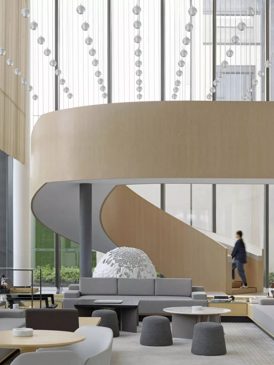 主要的休閑洽談區(qū)域通過(guò)強(qiáng)調(diào)垂直上的縱深感和透明度,營(yíng)造出一種平穩(wěn)而開(kāi)放的空間氛圍。與洽談區(qū)相鄰的咖啡吧坐落于一個(gè)巨大的木質(zhì)書架旁,書架隨著木飾樓梯一直延伸至二層,繼而連接起相對(duì)僻靜私密的閱讀空間。