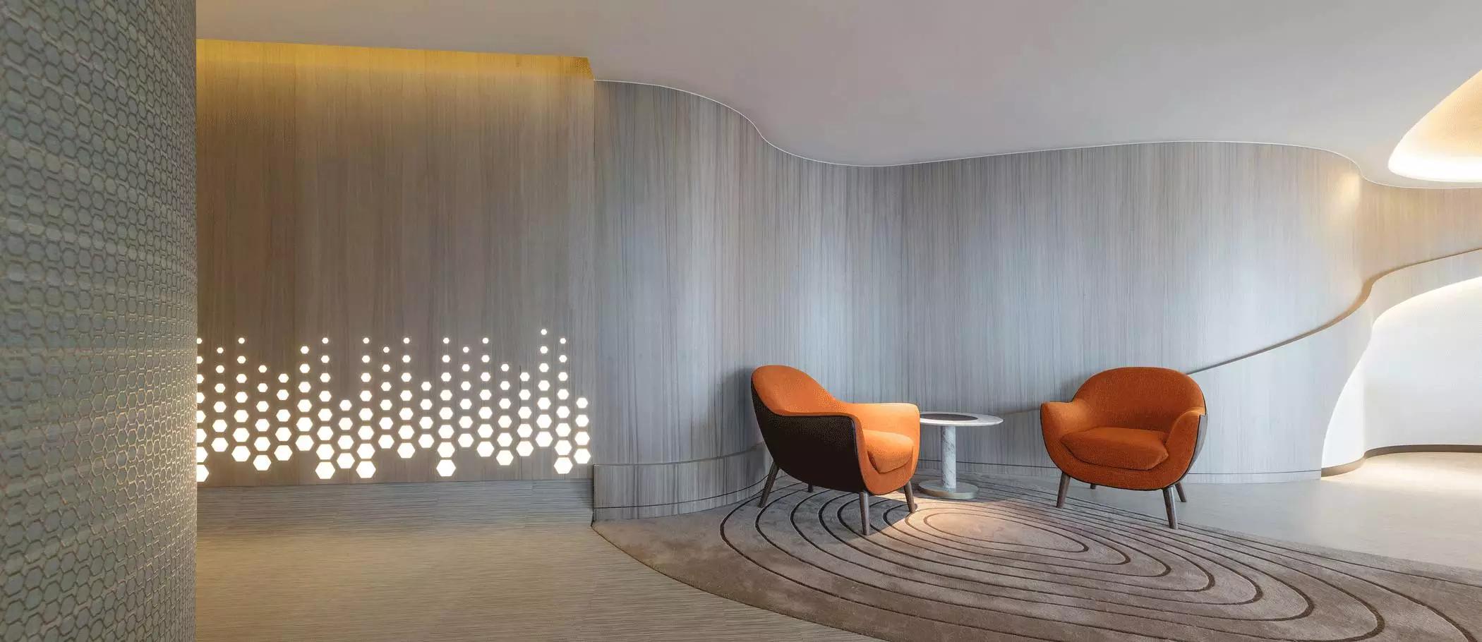 蜂窩形狀滲進天花至墻身的燈箱以及屏風,體現(xiàn)出大自然的親和力讓人心沈靜,宛若森林小徑,葉縫間穿過而灑落的陽光,體現(xiàn)日本韻文中的「Komorebi」靜謐而悠閑涵蘊希望。