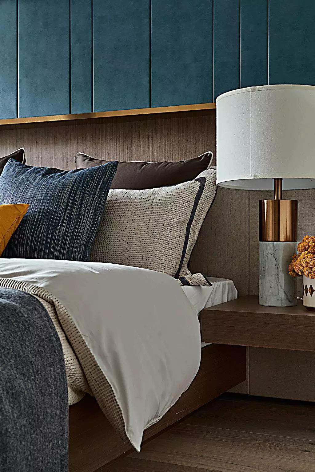 主臥,色彩沉穩(wěn)不失活力,黃銅和皮革造就空間的質(zhì)感,也如同雅痞們的堅(jiān)毅果敢、躊躇滿志。他們沒(méi)有頹廢情緒,一心追求奢侈舒適的生活。