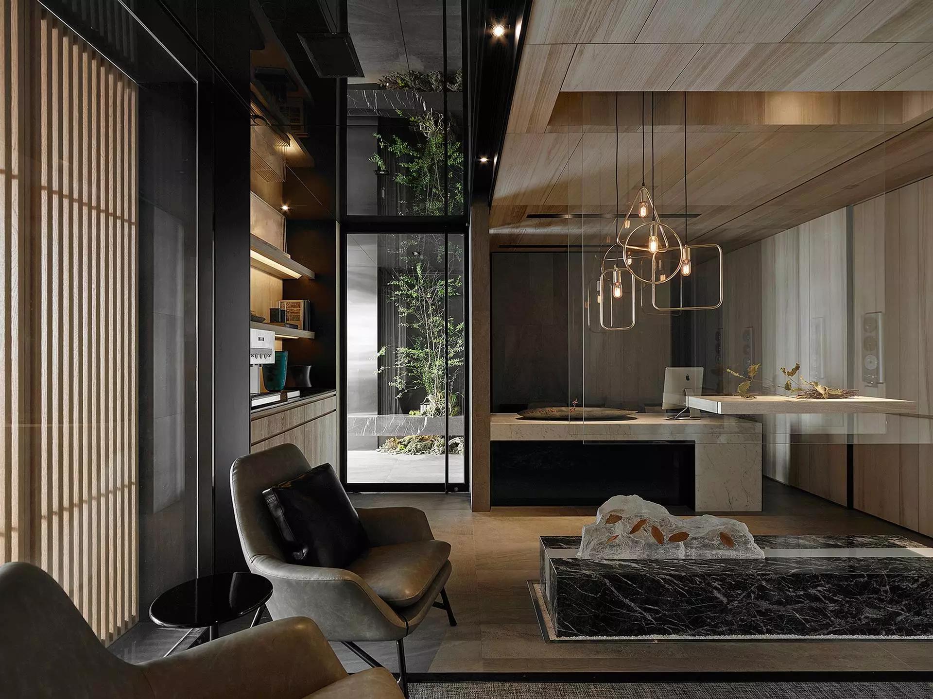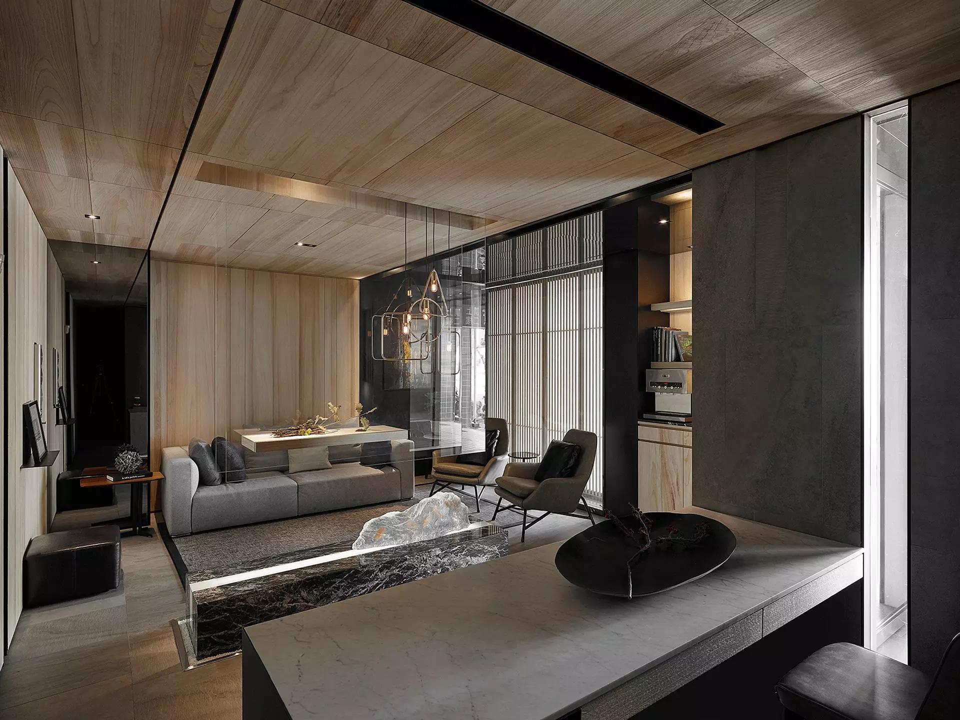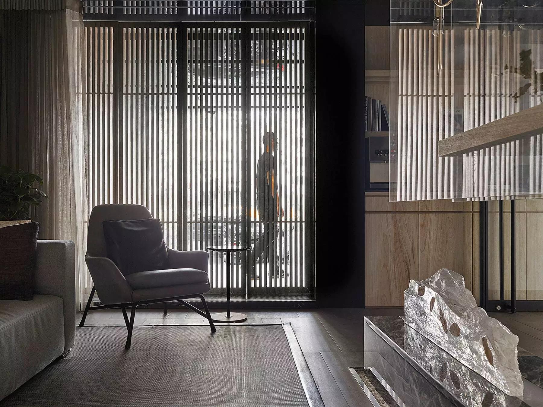 將玄關刻意退縮于室內、入口大門轉向,而產(chǎn)生一進一景之空間體驗層次,寬闊的騎樓面積與門口的虛空間,未踏入空間卻已感受沈穩(wěn)安定。
